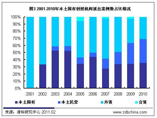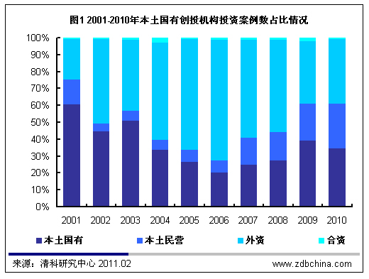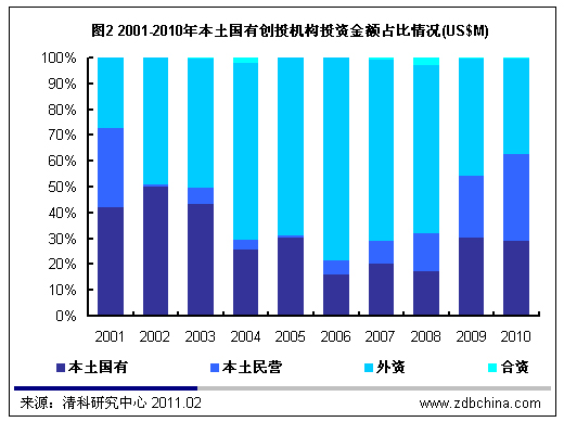 国资创投运作情况 纵观2001年至2010年的发展,以2006年为分界点,本土投资案例数和投资金额呈现“U型”变化的态势。早期,创投发展主要是政府驱动模式。 2000年的本土创投企业成立大潮中,国有资本(包括国家及地方政府财政资金、国有控股企业、大学及科研单位等)是本土创投的主要资金来源。资金来源和管 理体制的一些先天缺陷,以及创业板迟迟未开,打消了创投机构的积极性,在这波大潮中许多本土创投机构都难以继续发展。2006年以来,随着国内股权分置改 革的全面实施,中小板及创业投的推出,国家扶持政策的明确,以及民营企业和个人资本逐步介入到创投领域来,本土创投得到再次发展。外因方面,受金融危机爆 影响,自2008年底起外资创投投资步调放缓,为本土创投创造了绝佳的发展机遇,2009年至2010年本土创投投资案例数占比均超过60.0%,数量上 领先外资。(见图1和图2)