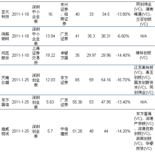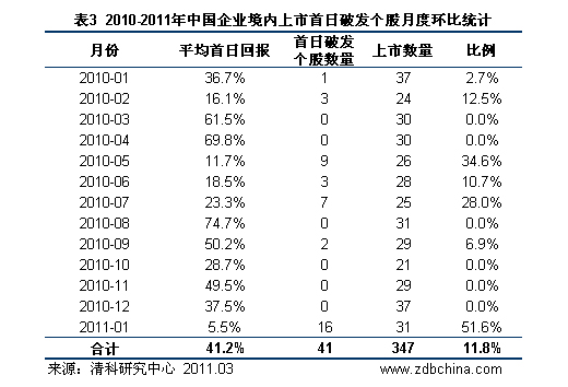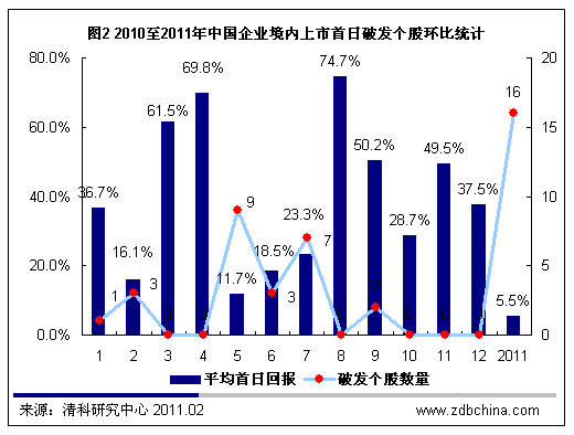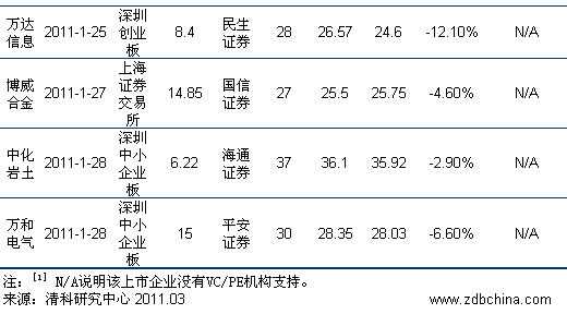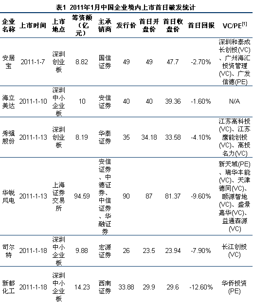 兔年春节的鞭炮声犹在耳畔,“金钱永不眠”的资本市场更是消息连连,其中中国经济以全年国内生产总值 587.56亿美元超越日本,坐上世界经济大国的第二把交椅成为市场上无可厚非的焦点。而与此同时,境内IPO市场所交出的答卷则略显寒酸,2011年1 月在境内资本市场发行的31支新股中,16支首日即破发;加上二级市场表现不佳,股市自2010年四季度起开始震荡下行,沪深两市一片愁云惨淡。大中华区 著名创业投资与私募股权研究机构清科研究中心针对此现象,通过企业上市数据的比较分析,并结合现行的IPO前夕路演询价机制进行了解读。 新股破发频频 “三高”问题凸显 2011年1月在境内资本市场上市31家企业中,共有16家企业上市首日破发,占比高达51.6%,其中有6家在深圳创业板上市,7家在深圳中小板上 市,3家在上海证券交易所上市;除“安居宝”、“海立美达”以发行价开盘外,其余14只股票均是跳空低开。沪市二十年第一高价股“华锐风电”以90.00 元的超高发行价登陆上交所,首日便舔舐到9.6%的跌幅,并一发不可收拾的持续下跌。16家首日破发的企业中的9家有VC/PE机构支持,占比达到 56.3%。