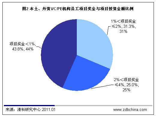 在报告中,清科研讨中心依据受访人员反应的的根本薪酬程度和过去一年中的增长状况、绩效薪酬程度、以及雇主称心度状况停止总结、剖析。以下是浮动薪酬局部的项目奖金、项目退出收益分红以及项目跟投机制程度的局部研讨结果: (一) 项目奖金 项目奖金是指项目担任人在其向投资决策委员会提交的投资项目取得审批经过,可取得该笔投资买卖一定比例的金额作为项目奖金。与年度奖金项目,项目奖金的 鼓励功用较强。在一切参与此次清科研讨中心薪酬调研的人员中,43.8%的人表示,在所参与项目取得投资决策委员会经过并落实后,所获得的项目奖金缺乏该 项目投资金额的1.0%。