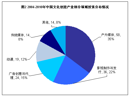 (备注:本文中“文化创意产业”主要是指以盈利目的,与文化活动相关,为消费者提供如影视、动漫、户外媒体、广告创意、传统媒体、网络游戏及音乐等文化 产品的产业。上述投资范围中主要包括影视、动漫、户外媒体、广告创意、传统媒体,网络游戏与音乐投资事情未统计在内。) 2004-2010 年,中国文化创意产业的局部细分范畴的投资事情主要集中在户外媒体,已披露的投资事情为58起,占比达35%,特别以2006-2008年表现最为明显。 追溯其开展历史,2006-2008年资本对户外媒体溺爱的主要缘由有三点:一是新旧媒体交替,户外媒体作为典型的“旧媒体”新媒体化呈现方式,在资本追 逐新媒体的过程中,自然惹起资本关注;二是2005年分众传媒上市,作为中国户外媒体领军人物的江南春,加速其在户外媒体范畴的攻城略地,使得资本市场看 到户外媒体市场的宏大机遇;三是户外电子屏作为典型的户外媒体方式,推进市场力气不容小觑。