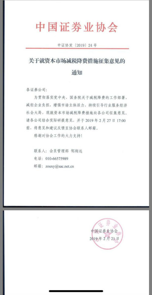 结合着网友“重大利好”的解读,这则通知很快刷了屏:通知称,为贯彻落实党中央、国务院关于减税降费的工作部署,减轻企业负担,增强市场主体活力,持续引导行业服务经济社会大局,现就资本市场减税降费措施向各证券公司征集意见。通知要求证券公司结合实际提出意见,并于2月27日17时前向协会反馈。