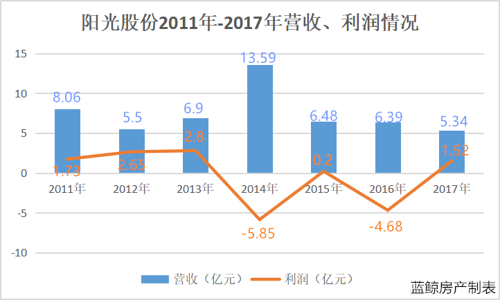 阳光股份除了缺少实际控制人之外,其自2011年开始正式转型商业地产之后的造血能力以及频频“卖股权套现”的动作也颇受市场关注。2010年至2017年,阳光股份营业收入从30.42亿元跌至最低5.34亿元,净利润从4.35亿元跌至亏损5.85亿元。