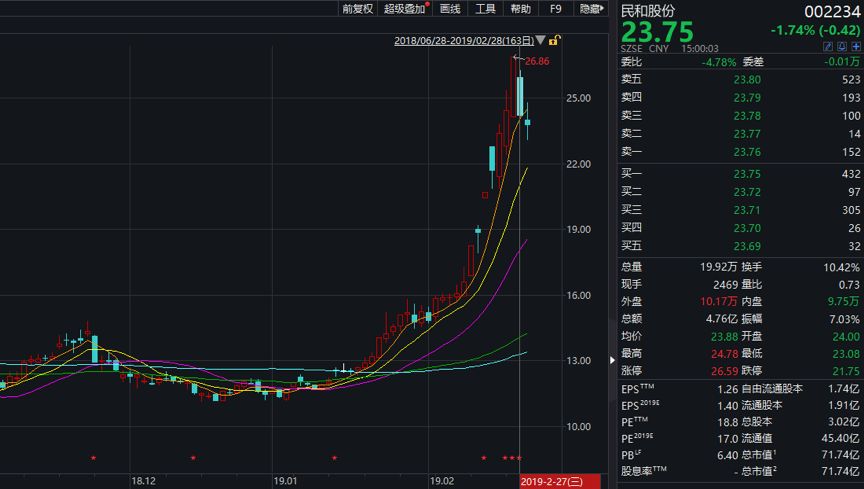 2019年初至2月26日,养鸡股民和股份(002234.SZ)股价涨幅达到134.59%。