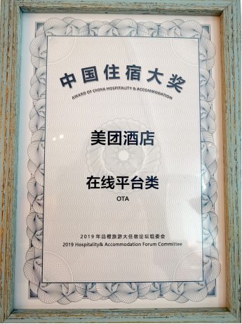 2019年4月25日,由品橙旅游主办,以“聚焦旅游度假区,时间空间共发展”为主题的2019大住宿论坛在北京召开,间夜量规模进入全球TOP3的美团酒店荣获“2019中国住宿大奖在线平台奖”。美团酒店相关责任人表示,将一如既往秉承“以客户为中心”,坚持科技创新,提升服务质量;坚守社会责任,持续为行业创造价值。