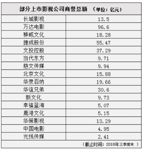 2018年以来,商誉问题在A股集中爆发。据统计,在2018年三季度末,A股公司商誉额创下历史新高,达到1.45万亿元,而当时A股全部上市公司的总市值也不足55万亿。而从行业层面来看,商誉问题在以影视为代表的轻资产行业尤为明显。