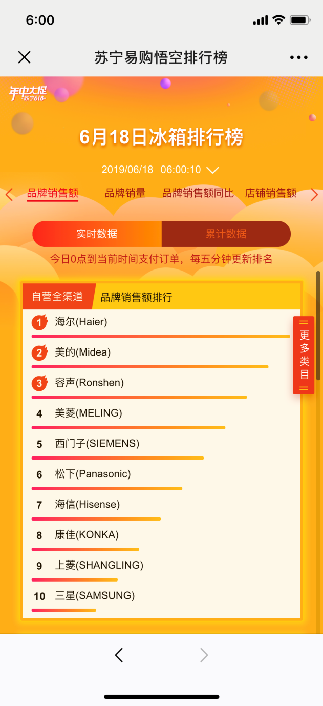 截至18日凌晨6点,经过“剁手党”们一晚的发力,苏宁618年中大促又有什么表现呢?通过苏宁悟空榜,我们一睹今年618大战前6小时的全民抢购的“饕殄盛宴”。