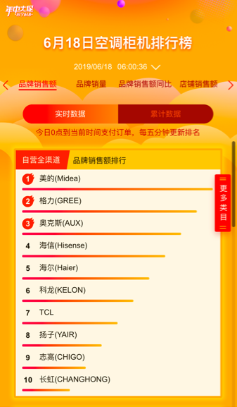在苏宁空调悟空榜6小时的排名中,美的终于夺得榜首。格力、奥克斯、海信紧随其后,销量排名咬的非常紧,可以看出来这场战争是异常的激烈。而最后空调榜单三甲到底会花落谁家,就目前来看,海信、海尔、奥克斯也都有可能。日前激烈的奥克斯和格力之争,暂时奥克斯被格力压制,两项争执的最终结果预估也将会在苏宁618悟空榜中体现。