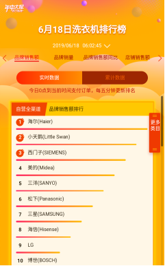 截至6月18日6点,在苏宁洗衣机悟空榜单实时榜单排名中,海尔品牌拔得头筹,小天鹅、西门子位列二三名,三洋、松下、海信、博世、LG、三星等品牌紧追不舍挤进前十。