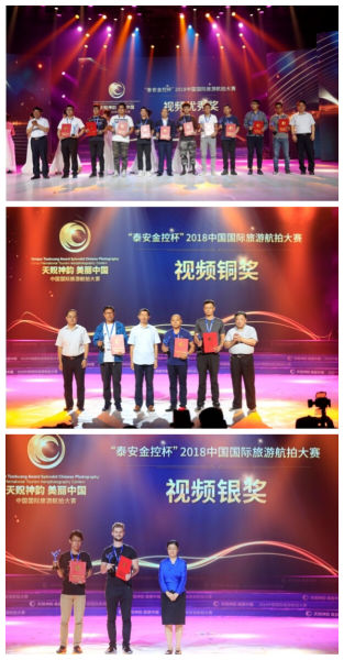 颁奖典礼上共揭晓了“泰安金控杯”2018中国国际旅游航拍大赛摄影类一等奖1个、二等奖2个、三等奖3个和最佳人气奖1个,以及视频类最佳影片奖和金奖各1个、银奖2个、铜奖3个、优秀奖10个。